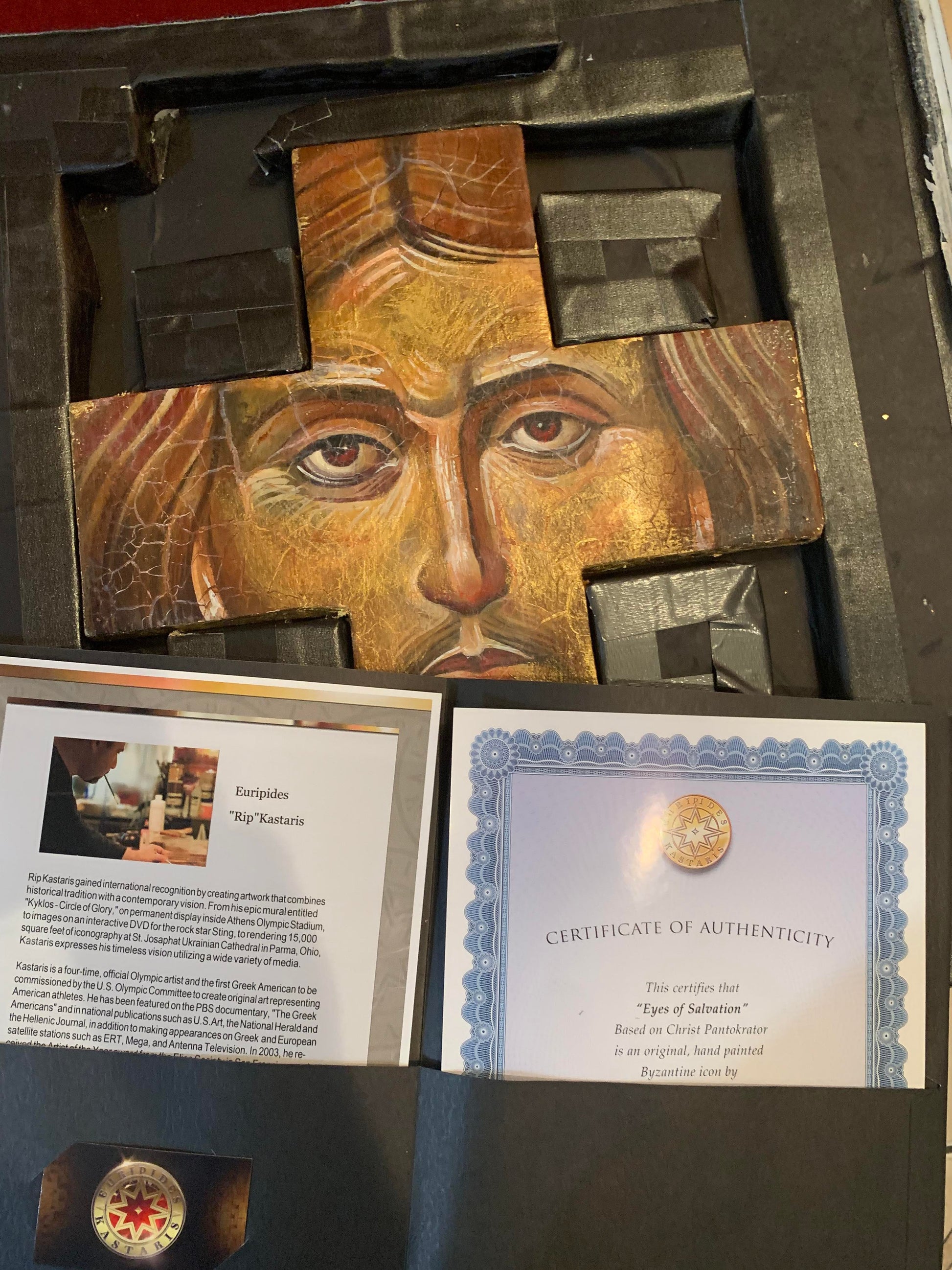 3. An original hand painted byzantine icon on a prepared wooden panel with archival media and gold leaf. This has the artist's benchmark initials and signature on the back.